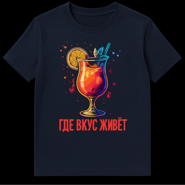 Adding a unique cultural touch, the Russian text “ŠŠŠ ŠŠŠ£Š” ŠŠŠŠŠ¢” is prominently displayed in vibrant red below the graphic. This phrase translates to “Where Taste Lives,” a playful and universal declaration that speaks to the heart of culinary and beverage enjoyment. It’s a clever way to express appreciation for deliciousness, making it a fun conversation starter and a nod to global flavors. This t-shirt is ideal for anyone who loves cocktails, vibrant art, or simply wants to wear a piece that combines refreshing imagery with a witty, cross-cultural message.
