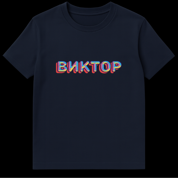 Step back in time with our unique “Š’Š˜ŠšŠ¢ŠžŠ ” (Viktor) T-Shirt, a playful tribute to 80s pop art. This eye-catching design features the name “Viktor” in Cyrillic, rendered in a dynamic 3D style that pops off the fabric. Each letter is meticulously crafted with a dark blue outline, filled with a delightful mix of patterns: cheerful blue polka dots, bold pink stripes, and energetic yellow diagonal lines. A vibrant red shadow beneath the letters creates an impressive three-dimensional effect, enhancing its retro appeal. This t-shirt embodies a playful and vibrant spirit, reminiscent of classic 80s aesthetics, making it a perfect statement piece for anyone named Viktor or those who appreciate unique, retro-inspired fashion. It’s more than just a name; it’s a wearable piece of art that brings a splash of color and nostalgia to your wardrobe.