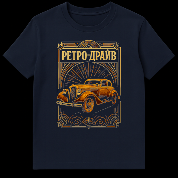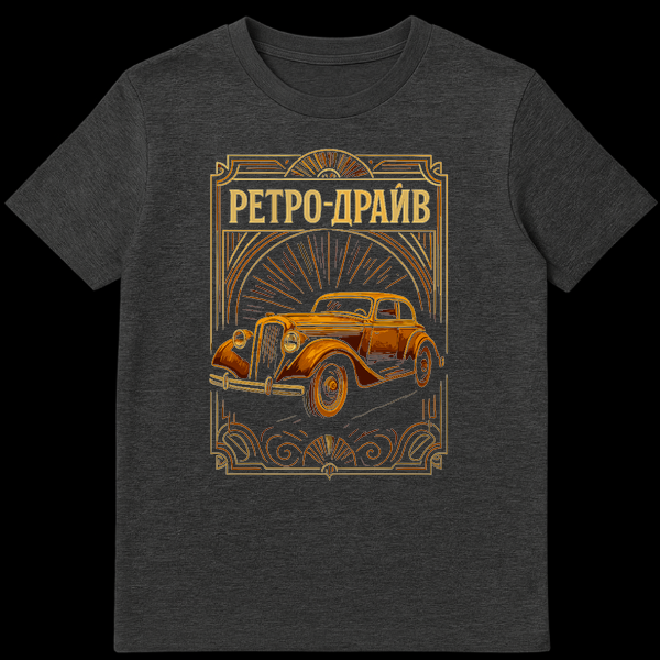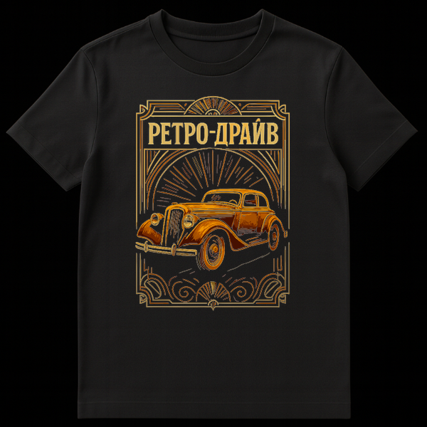 Above the vintage car, the bold text “Š ŠŠ¢Š Š-ŠŠ ŠŠŠ” is displayed in a matching Art Deco font. This Cyrillic phrase translates to “RETRO-DRIVE” in English, serving as a playful and direct celebration of vintage culture and the thrill of classic motoring. The entire composition is crafted in a style that distinctly recalls early 20th-century poster art, characterized by its clean lines, striking imagery, and evocative typography.