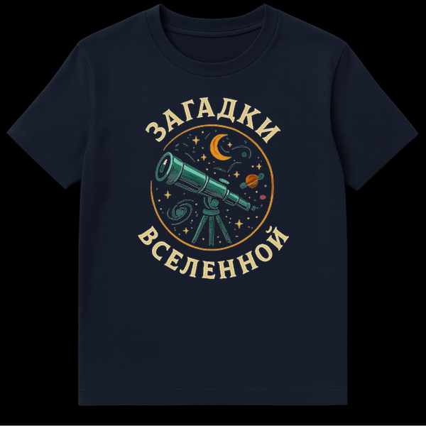 Arching gracefully above and below this cosmic tableau is the Russian text “ЗАГАДКИ ВСЕЛЕННОЙ.” This phrase translates directly to “Riddles of the Universe,” a poignant and thought-provoking slogan that resonates with anyone who has ever gazed at the night sky and pondered its secrets. It’s not just a translation; it’s an invitation to contemplate the vast, unexplained phenomena that lie beyond our world. The inclusion of Russian text adds an authentic, intriguing cultural layer, appealing to those with an interest in language, astronomy, or a unique, globally inspired style. This t-shirt is more than just apparel; it’s a wearable piece of art that sparks conversation and celebrates the boundless quest for knowledge.