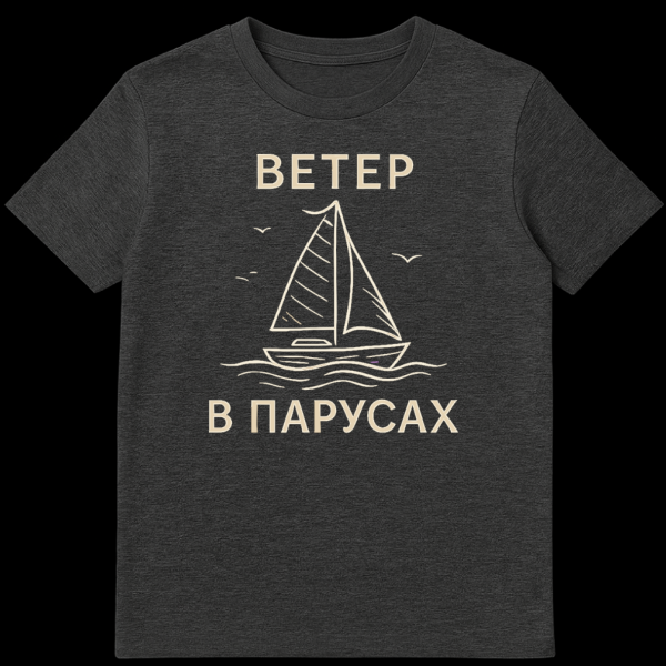 This serene t-shirt features a minimalist line-art sailboat on wavy water, accompanied by three small birds, all rendered in a light beige on a solid gray background. The Russian text ‘VETER’ (Wind) above and ‘V PARUSAH’ (In Sails) below, translates to ‘Wind in the Sails,’ symbolizing good fortune and a smooth journey.