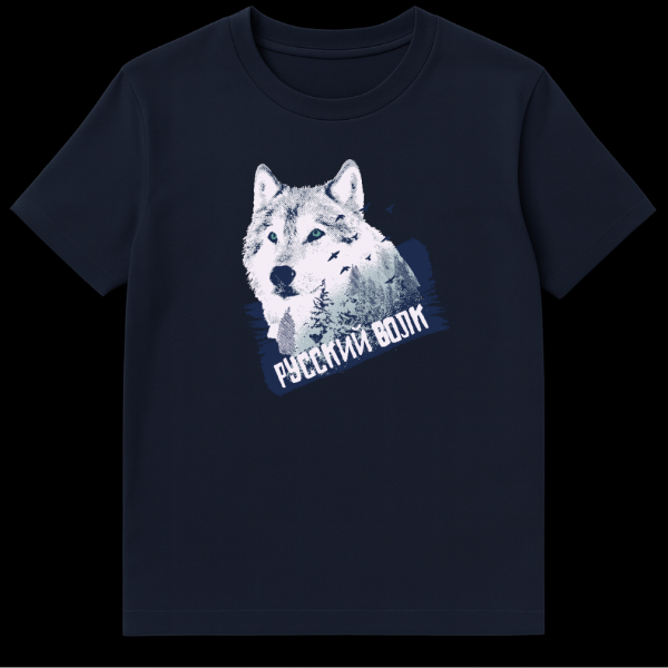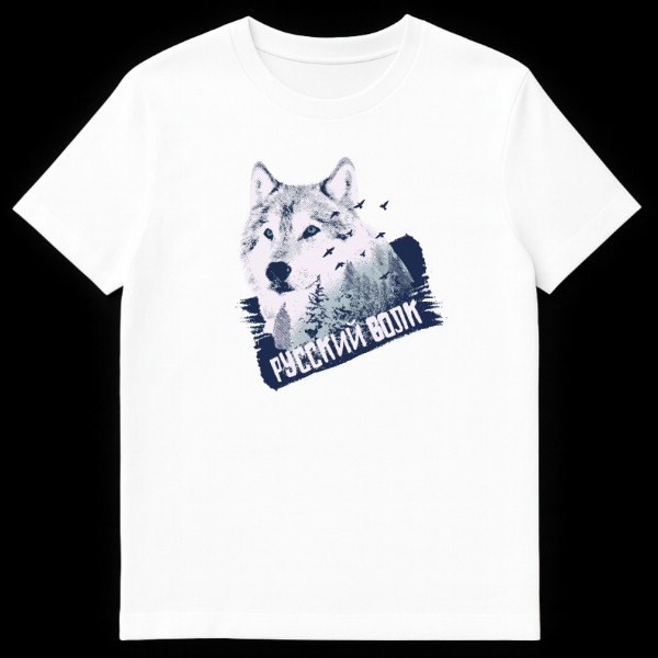 Unleash your inner wilderness with this captivating t-shirt, showcasing a powerful stylized wolf head in a unique distressed and textured style. The dominant colors of white, light blue, dark blue, and a subtle hint of teal in the wolf’s eyes evoke the serene yet untamed beauty of nature. Forest scenery and birds subtly integrate into the design, enhancing its natural, rugged aesthetic. The theme is deeply rooted in nature and wilderness, appealing to those who appreciate a strong, earthy vibe. The text “РУССКИЙ ВОЛК” (RUSSIAN WOLF) is prominently displayed in a bold, distressed font, angled at the bottom right, adding an authentic touch. This phrase directly translates to “RUSSIAN WOLF”, a powerful and iconic symbol often associated with strength, resilience, and the untamed spirit of the Russian landscape and folklore. There is no specific joke associated with this design; its appeal lies in its strong visual and cultural symbolism, making it a statement piece for anyone drawn to the wild.