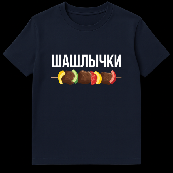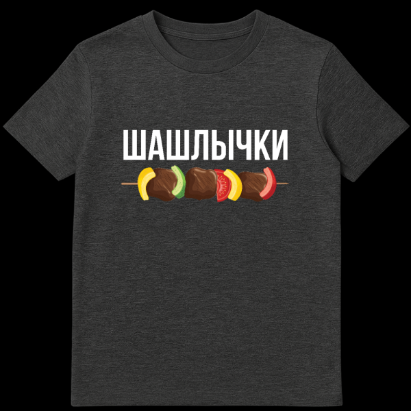 Show your love for Russian barbecue with this playful t-shirt. It features a cartoon shish kebab illustration below the large white Russian text “SHASHLYCHKI,” meaning ‘little shashliks’ or ‘skewers of meat,’ a term of endearment for this beloved dish.