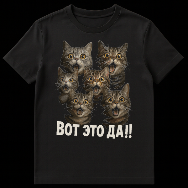 Adding to the humor and cultural flair, beneath the adorable felines is the bold, white Cyrillic text “ŠŠŠ¢ ŠŠ¢Š ŠŠ!!” which translates to the universally understood exclamation, “WOW!!” or “OH, MY GOODNESS!!”. The joke lies in the perfect synergy between the cats’ comically startled expressions and the emphatic Russian phrase, creating a fun, relatable, and genuinely funny statement piece.