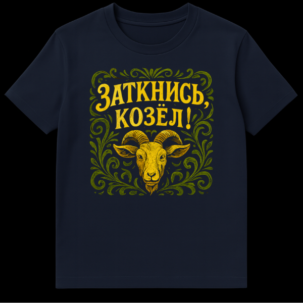 Dive into a blend of bold humor and rustic charm with this distinctive t-shirt. At its heart, a striking stylized yellow goat head commands attention, positioned beneath powerful, distressed yellow Russian text. The phrase ‘ЗАТКНИСЬ, КОЗЁЛ!’ translates directly to ‘Shut up, goat!’ – a playful yet assertive expression, often used humorously in Russian culture to tell someone to stop being silly or annoying. This central motif is beautifully framed by intricate, dark green ornate floral and vine scrollwork, all set against a subtle grey background. The overall aesthetic channels a classic folk art or vintage woodcut style, giving it a timeless appeal. Perfect for those who appreciate unique cultural references, a touch of edgy humor, and artistic designs. It’s a fantastic conversation starter that combines traditional artistry with a modern, witty statement.