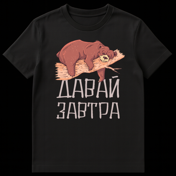Adding to its playful appeal, the Russian phrase “ŠŠŠŠŠ ŠŠŠŠ¢Š Š” (Davay Zavtra) is prominently displayed below the bear in a light, slightly uneven, blocky font. This phrase directly translates to “Let’s do it tomorrow,” serving as a witty and culturally resonant punchline to the bear’s serene slumber. It’s a nod to the often-humorous tendency to put things off, a sentiment many can instantly connect with. Perfect for those who appreciate a good nap, a relaxed pace, or a clever linguistic joke, this t-shirt is sure to bring a smile and spark conversations.