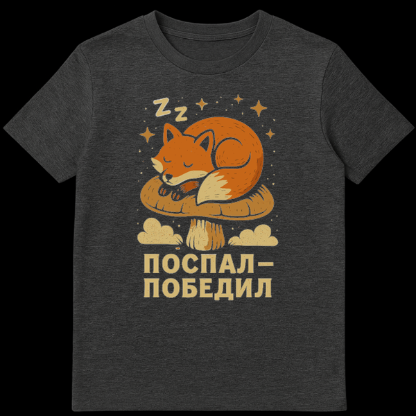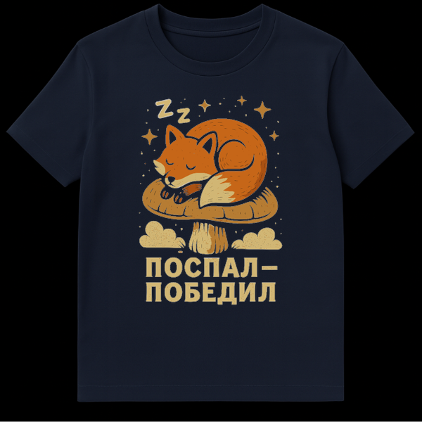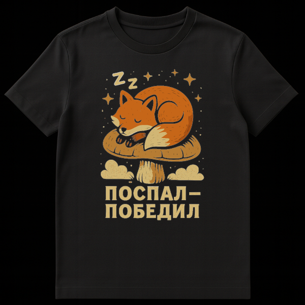 Below this serene imagery, the t-shirt features the Russian phrase ‘ПОСПАЛ – ПОБЕДИЛ,’ which directly translates to ‘Slept – Won.’ This popular, humorous Russian expression playfully flips the traditional idea of ‘came, saw, conquered’ (Veni, vidi, vici) or ‘worked hard, won.’ Instead, it suggests that the true path to victory and success lies in getting enough rest. It’s a lighthearted jab at hustle culture, celebrating the power of a good nap or a full night’s sleep as the ultimate strategy for winning at life. This clever slogan adds a touch of cultural wit, making the t-shirt not just a piece of clothing, but a conversation starter and a statement about prioritizing well-being.
