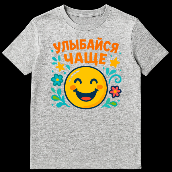 Brighten your day with this cheerful yellow emoji t-shirt, featuring rosy cheeks and a wide smile. Above it, orange text ‘Ulybaysya Chashche’ translates to ‘Smile More Often,’ encouraging positivity. Whimsical teal swirls, stars, and flowers add a playful touch to the gray background.