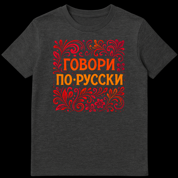 Embrace cultural flair with this captivating t-shirt, showcasing a powerful message rooted in tradition. The central feature is the bold, orange Cyrillic text “ŠŠŠŠŠ Š ŠŠ-Š Š£Š”Š”ŠŠ,” which translates to “SPEAK RUSSIAN.” This direct and assertive slogan, while not a joke in the traditional sense, serves as a fun and engaging call to action or a proud statement for those who love the Russian language and culture. The text is beautifully framed by vibrant red and orange floral and scrollwork patterns, meticulously designed in a classic Russian folk art style. This intricate artwork evokes the rich heritage of Khokhloma or Gorodets painting, known for its bright colors and nature-inspired motifs. Set against a versatile gray background, the design truly pops, making it a stylish and conversation-starting piece for anyone passionate about linguistics, Slavic culture, or unique artistic expressions.