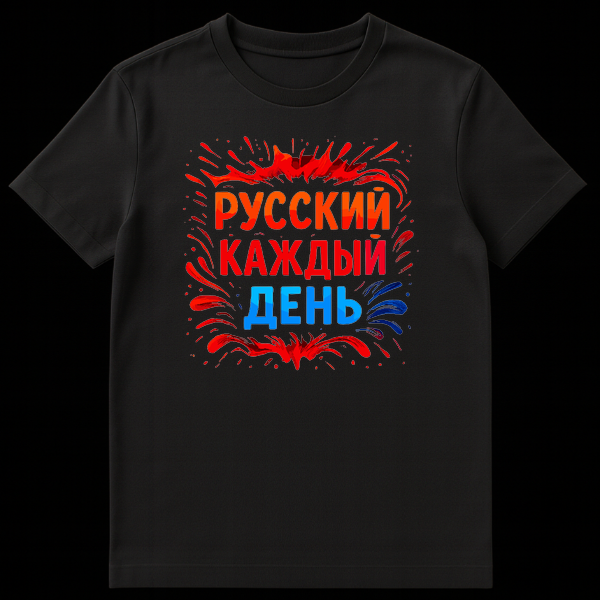 This dynamic t-shirt showcases bold, block-style Russian text, “Š Š£Š”Š”ŠšŠ˜Š™ ŠšŠŠ–Š”Š«Š™ Š”Š•ŠŠ¬,” which translates to “Russian Every Day.” The slogan is presented in an eye-catching red, orange, and blue gradient, surrounded by an energetic, painterly splash effect in coordinating red and blue.