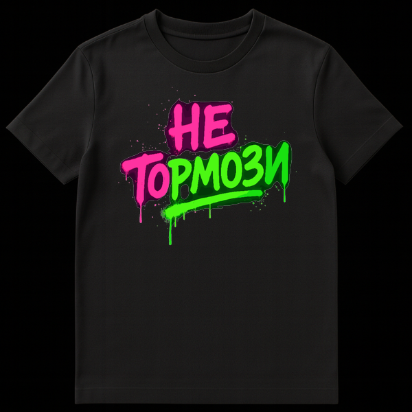 The text is rendered in a dynamic, graffiti-style font, giving it an authentic spray-painted look. The first word, “ŠŠ” (Ne), glows in a fiery hot pink, while the second word, “Š¢ŠŠ ŠŠŠŠ” (Tormozi), electrifies in a bright neon green. Both words are adorned with realistic drips and splatters, enhancing the raw, edgy feel of urban street art. Set against a deep black background, these colors explode with energy, making the slogan impossible to ignore. This design isn’t just a statement; it’s a lifestyle, celebrating momentum, progress, and a fearless attitude. It’s a playful yet powerful cultural reference, often used colloquially to encourage speed and decisiveness. Perfect for those who appreciate bold graphics, unique cultural flair, and a message that resonates with a go-getter spirit.