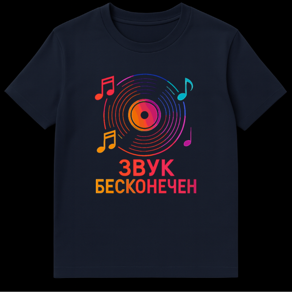 Embrace the universal language of music with our unique Russian T-Shirt. The centerpiece is a stunning, gradient-colored graphic of a stylized vinyl record, radiating lines, and four musical notes, all rendered in a modern, colorful aesthetic. This dynamic visual perfectly captures the energy and timelessness of sound. Below this captivating artwork, the bold, sans-serif Russian text “ŠŠŠ£Š ŠŠŠ”ŠŠŠŠŠ§ŠŠ” (pronounced ‘Zvuk Beskonechen’) is prominently displayed, also featuring a vibrant gradient color scheme. This powerful phrase translates to “Sound is Infinite,” a profound statement for audiophiles, musicians, and anyone who believes in the boundless nature of melody and rhythm. It’s a stylish way to express your passion for music and a nod to Russian culture and language, making it a truly distinctive addition to any wardrobe.