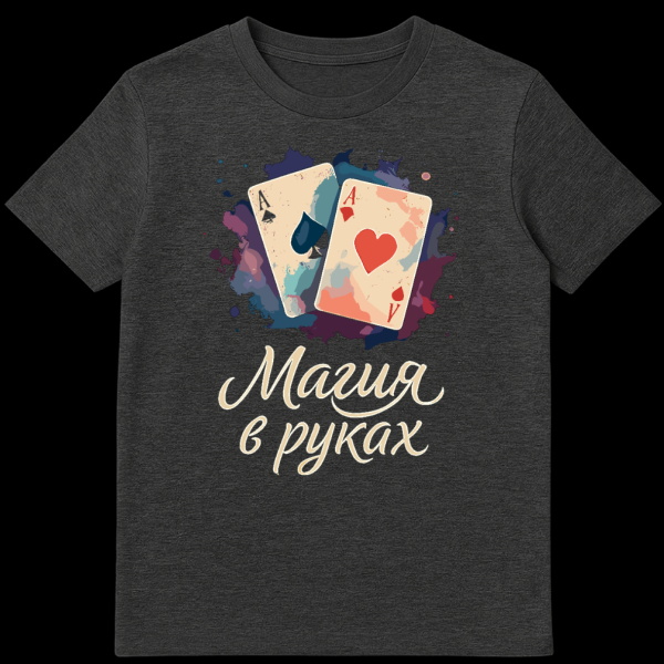 Adding a unique cultural touch, the Russian phrase ‘ŠŠ°Š³ŠøŃ в ŃŃŠŗŠ°Ń ’ (Magic in hands) is elegantly scripted below the cards. This slogan perfectly encapsulates the theme, referring to the skill and dexterity required for card tricks, the strategic thinking in card games, or simply the ability to create wonder with one’s own hands. It’s a subtle nod to the power of human skill and ingenuity. This t-shirt is ideal for magicians, card game enthusiasts, or anyone who appreciates a blend of vintage art, unique cultural references, and a touch of enigmatic charm.