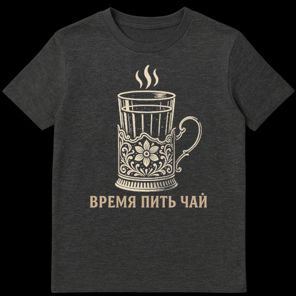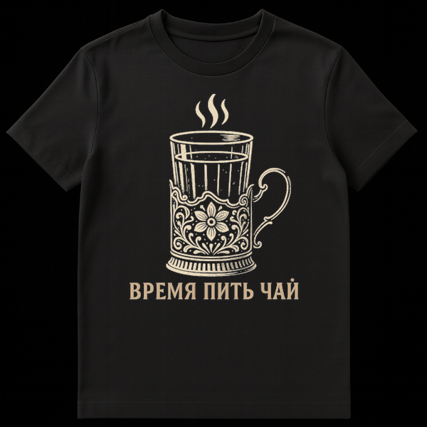 This t-shirt showcases a stylized, vintage-look illustration of a steaming glass of tea in an ornate, traditional Russian podstakannik. Rendered in a classic woodcut style with a limited beige on black palette, it evokes timeless elegance. The phrase “VREMYA PIT’ CHAY” below translates to “Time to drink tea,” a warm invitation to enjoy a cherished cultural ritual.