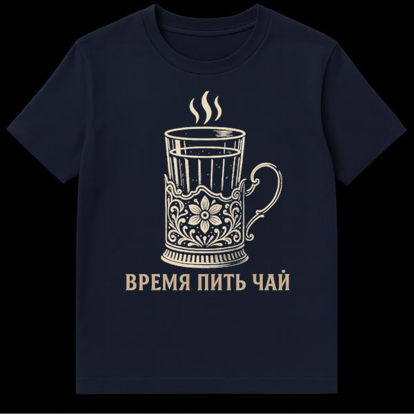Embrace the enduring charm of Russian tea culture with this captivating t-shirt. The design features a stunning, vintage-look illustration of a steaming glass of tea, nestled within an ornate, traditional Russian podstakannik ā a decorative metal holder for tea glasses. The artistic style is reminiscent of classic woodcut or engraving, utilizing a sophisticated, limited color palette of beige/off-white against a deep black background, which enhances the intricate details and gives it a timeless appeal. This design celebrates the deep-rooted tradition of Russian tea-drinking, a social ritual often accompanied by warmth and conversation. Below the evocative image, the text “ŠŠ ŠŠŠÆ ŠŠŠ¢Š¬ Š§ŠŠ” (VREMYA PIT’ CHAY) translates to “Time to drink tea.” This simple yet profound phrase is more than just words; it’s an invitation, a cultural touchstone that signifies a moment of pause, comfort, and connection. It’s a subtle nod to anyone familiar with the Russian language and culture, making it a unique conversation starter and a tribute to a beloved tradition.