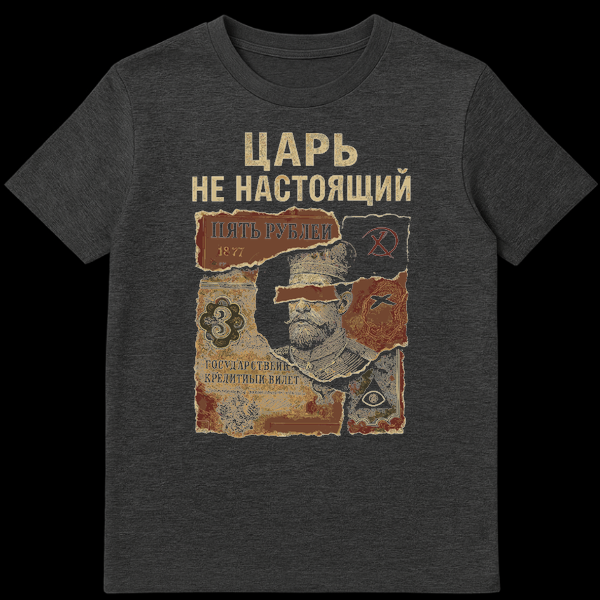 The design’s core message is powerfully conveyed by the text at the top: ‘Š¦ŠŠ Ь ŠŠ ŠŠŠ”Š¢ŠŠÆŠ©ŠŠ’ which translates to ‘TSAR IS NOT REAL’. This phrase, often used in Russian culture to denote a fake or illegitimate authority figure, adds a layer of critical or satirical commentary on power, authority, and historical revisionism. Additional visible text, ‘ŠŠÆŠ¢Š¬ Š Š£ŠŠŠŠ’ (FIVE RUBLES), ‘1877’, and ‘ŠŠŠ”Š£ŠŠŠ Š”Š¢ŠŠŠŠŠ«Š ŠŠ ŠŠŠŠ¢ŠŠ«Š ŠŠŠŠŠ¢’ (STATE CREDIT NOTE), further grounds the design in a historical Russian context, enhancing its authenticity and depth. This t-shirt is perfect for those who appreciate history, political commentary, and a distinctive, artistic grunge style.