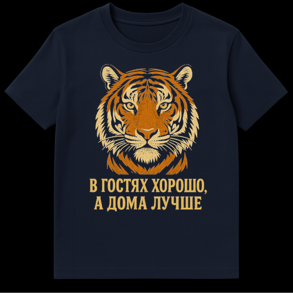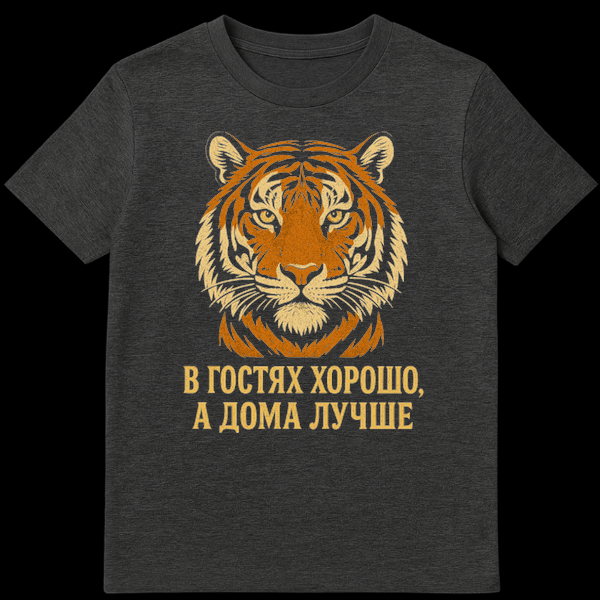 This striking t-shirt features a stylized, distressed tiger face, rendered in warm orange and beige tones, exuding a cool, vintage aesthetic. Below this powerful feline imagery, a bold, retro-style Russian text delivers a classic, humorous saying: “Гости хорошо, а дома лучше,” which translates to “Guests are good, but home is better.” This phrase is a beloved cultural reference, often shared with a knowing smile, perfectly capturing the comfort and sanctity of one’s own space after social gatherings. It’s a playful nod to hospitality while subtly celebrating the joys of being at home. The design’s distressed finish adds to its authentic, lived-in appeal, making it a conversation starter with a touch of old-world charm and a relatable, funny message.
