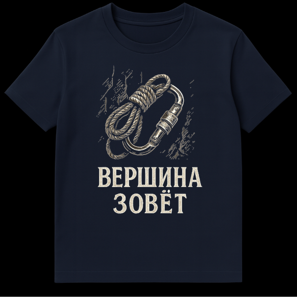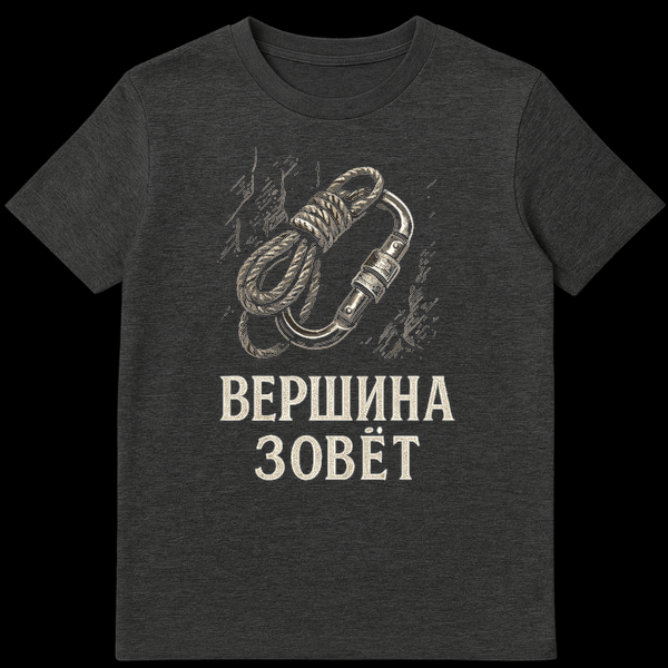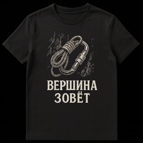 This t-shirt features a vintage woodcut-style illustration of a coiled climbing rope and carabiner on a dark, textured background. The Cyrillic text “ŠŠŠ ŠØŠŠŠ ŠŠŠŠŠ¢” translates to “The Summit Calls,” embodying the spirit of mountaineering adventure and aspiration. It’s a powerful message for any climbing enthusiast.
