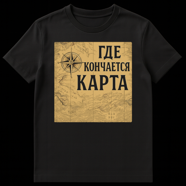 This vintage-style t-shirt features an antique sepia map background with a prominent compass rose. Bold grey Cyrillic text, “GDE KONCHAETSYA KARTA,” translates to “WHERE THE MAP ENDS,” evoking a spirit of adventure and discovery.