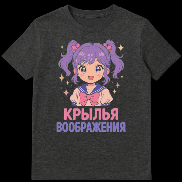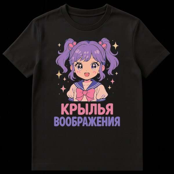 Embrace enchantment with this t-shirt featuring a cheerful anime girl with purple pigtails and sparkling eyes, dressed in a sailor uniform with a pink bow. The bright, cute kawaii aesthetic is enhanced by scattered stars, creating a whimsical and imaginative theme. The Cyrillic text translates to “WINGS OF IMAGINATION,” inviting dreams and creativity.