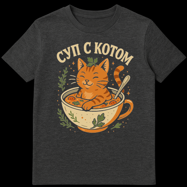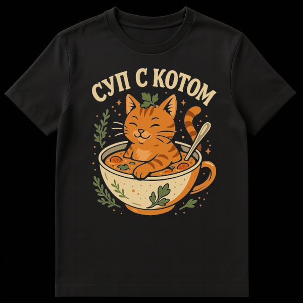 The design’s theme is delightfully humorous, playing on the literal translation of the Russian phrase “ДУРД ŠŠŠ¢ŠŠ” (SUP S KOTOM), which means “Soup with a cat.” This clever linguistic joke transforms a common phrase into a literal, amusing image, making it a perfect conversation starter. It’s a lighthearted take on language and a playful nod to Russian culture, offering a unique blend of cuteness and wit.